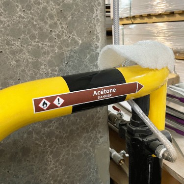 Grâce à la norme NFX 08-105, chaque fluide appartient à une famille propre représentée par une couleur spécifique. Une flèche placée à l’extrémité de l’autocollant indique également le sens de circulation du flux. Cette flèche est prédécoupée pour faciliter la pose. Cela permet donc de repérer rapidement quel fluide circule dans les tuyaux, et dans quel sens, afin d’éviter tout accident ou risque de pollution.